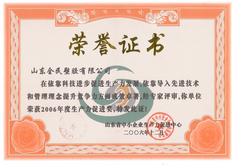 省级生产力促进奖荣誉证书2006.12